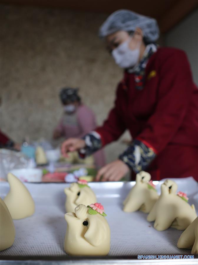 SHANDONG, enero 8, 2019 (Xinhua) -- Empleados elaboran panecillos al vapor en la ciudad Laixi de Qingdao, en la provincia de Shandong, en el este de China, el 8 de enero de 2019. Los panecillos al vapor con dise?os coloridos son un alimento tradicional durante el Festival de Primavera en algunas partes de China. (Xinhua/Ding Hongfa)