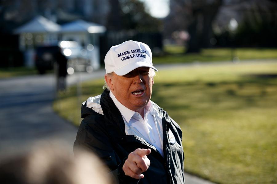 El presidente estadounidense, Donald Trump, conversa con representantes de los medios de comunicación previo a su salida de la Casa Blanca, en Washington D.C., Estados Unidos, el 10 de enero de 2019. El presidente de Estados Unidos, Donald Trump, dijo el jueves que es "casi seguro" que declare una emergencia nacional en la frontera con México, una controversial opción que el presidente ha estado contemplando públicamente desde la semana pasada. (Xinhua/Ting Shen)
