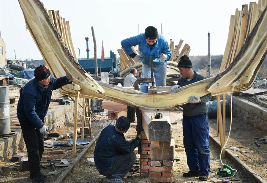 SHANDONG, enero 11, 2019 (Xinhua) -- Imagen del 10 de enero de 2019 de carpinteros de barcos trabajando en el astillero Hongshuangmu, en Qingdao, provincia de Shandong, en el este de China. Hongshuangmu es uno de los pocos astilleros tradicionales de construcción a mano que quedan en el área adyacente. (Xinhua/Li Ziheng)