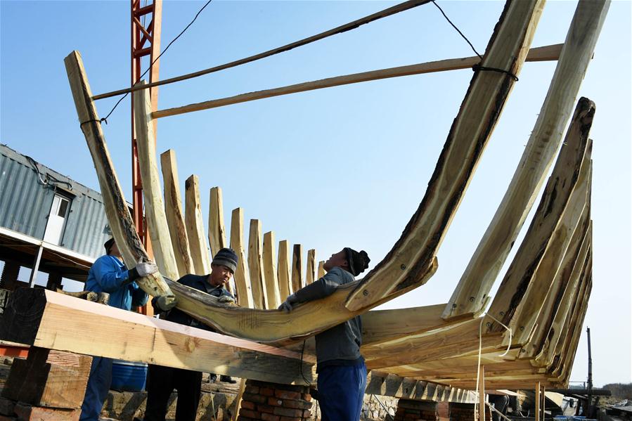 SHANDONG, enero 11, 2019 (Xinhua) -- Imagen del 10 de enero de 2019 de carpinteros de barcos trabajando en el astillero Hongshuangmu, en Qingdao, provincia de Shandong, en el este de China. Hongshuangmu es uno de los pocos astilleros tradicionales de construcción a mano que quedan en el área adyacente. (Xinhua/Li Ziheng)