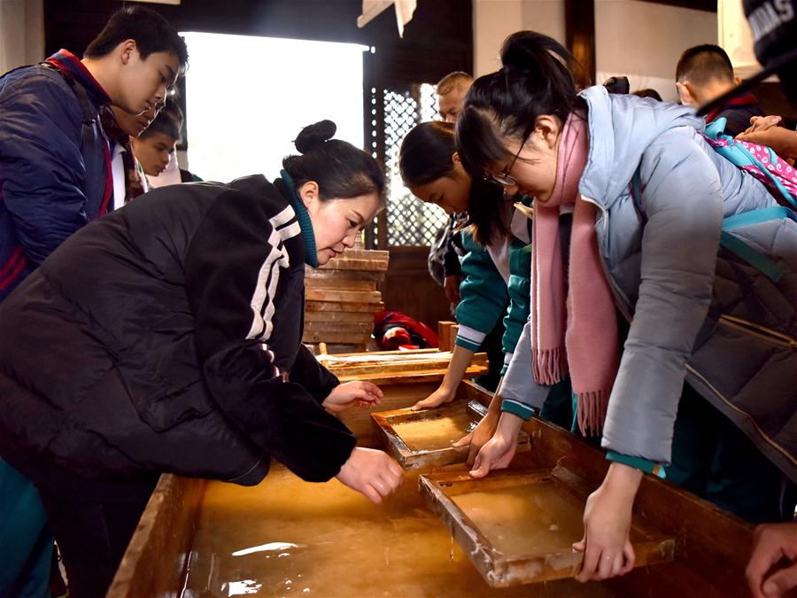 GUIZHOU, enero 11, 2019 (Xinhua) -- Imagen del 10 de enero de 2019 de estudiantes aprendiendo a fabricar papel a mano, en la localidad de Wanda, en el condado de Danzhai de la Prefectura Autónoma Miao y Dong de Qiandongnan, provincia de Guizhou, en el suroeste de China. Muchos estudiantes visitan el lugar para experimentar las técnicas tradicionales como el batik y la fabricación de papel. (Xinhua/Pan Huangquan)