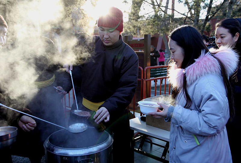 Durante el octavo día del duodécimo mes del calendario lunar chino, el templo Yonghe abrió al público de forma gratuita y distribuyó gachas de avena para conmemorar la fecha.