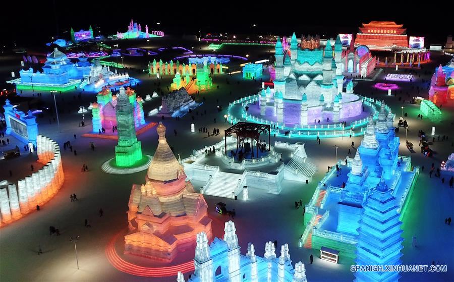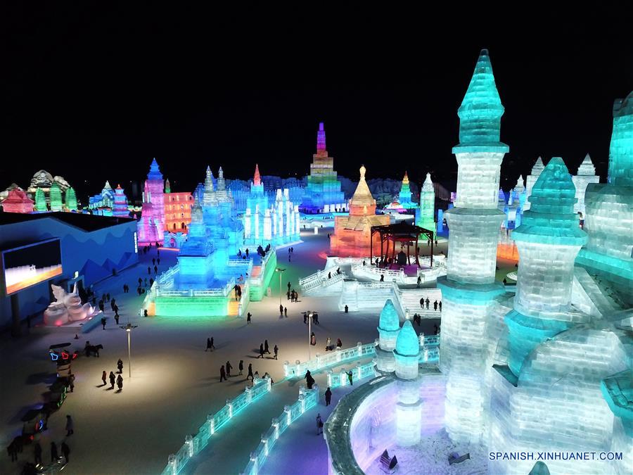 HEILONGJIANG, enero 15, 2019 (Xinhua) -- Vista aérea de una escena del Mundo de Hielo y Nieve de Harbin, en la provincia de Heilongjiang, en el noreste de China, el 15 de enero de 2019. Harbin, la "ciudad de hielo" del noreste de China, comenzó su 35 Festival Internacional de Hielo y Nieve el 5 de enero, con una gama de deportes de nieve y actividades divertidas. Los organizadores informaron que el festival de un mes de duración presenta cerca de 100 actividades que incluyen concursos de natación de invierno y de escultura de hielo familiares, así como los mu?ecos de nieve 2019 erigidos en un área de 10 hectáreas sobre el congelado río de la ciudad. (Xinhua/Wang Song)