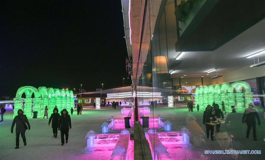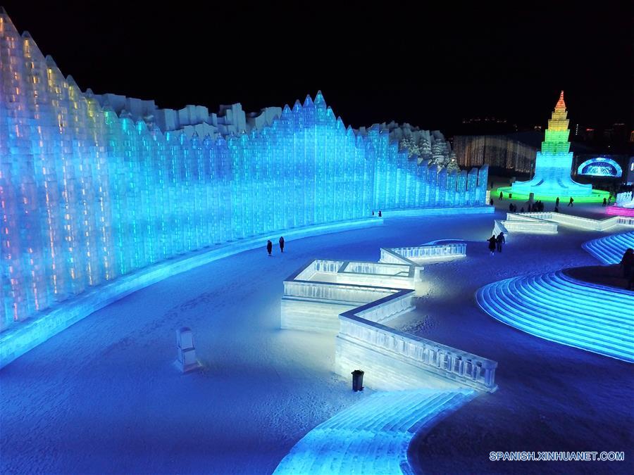 HEILONGJIANG, enero 15, 2019 (Xinhua) -- Vista de una escena del Mundo de Hielo y Nieve de Harbin, en la provincia de Heilongjiang, en el noreste de China, el 15 de enero de 2019. Harbin, la "ciudad de hielo" del noreste de China, comenzó su 35 Festival Internacional de Hielo y Nieve el 5 de enero, con una gama de deportes de nieve y actividades divertidas. Los organizadores informaron que el festival de un mes de duración presenta cerca de 100 actividades que incluyen concursos de natación de invierno y de escultura de hielo familiares, así como los mu?ecos de nieve 2019 erigidos en un área de 10 hectáreas sobre el congelado río de la ciudad. (Xinhua/Wang Song)