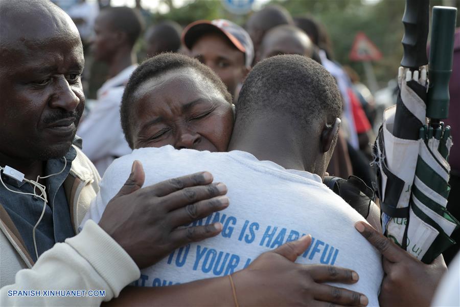 NAIROBI, enero 15, 2019 (Xinhua) -- Personas se abrazan luego de ser evacuadas del área de un ataque en un hotel de lujo y complejo de negocios en Nairobi, Kenia, el 15 de enero de 2019. La policía de Kenia está rescatando a las personas que quedaron atrapadas dentro de un hotel y edificios circundantes después de que se reportara una explosión seguida de intensos disparos en el área Riverside en Nairobi, la capital keniana. (Xinhua/Lyu Shuai)