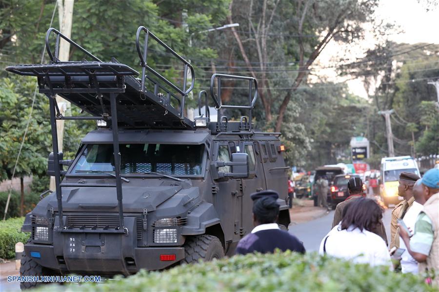 NAIROBI, enero 15, 2019 (Xinhua) -- Fuerzas de seguridad montan guardia cerca del área de un ataque en un hotel de lujo y complejo de negocios en Nairobi, Kenia, el 15 de enero de 2019. La policía de Kenia está rescatando a las personas que quedaron atrapadas dentro de un hotel y edificios circundantes después de que se reportara una explosión seguida de intensos disparos en el área Riverside en Nairobi, la capital keniana. (Xinhua/Wang Teng)
