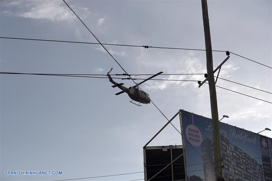 NAIROBI, enero 15, 2019 (Xinhua) -- Un helicóptero sobrevuela el área de un ataque en un hotel de lujo y complejo de negocios en Nairobi, Kenia, el 15 de enero de 2019. La policía de Kenia está rescatando a las personas que quedaron atrapadas dentro de un hotel y edificios circundantes después de que se reportara una explosión seguida de intensos disparos en el área Riverside en Nairobi, la capital keniana. (Xinhua/Wang Teng)
