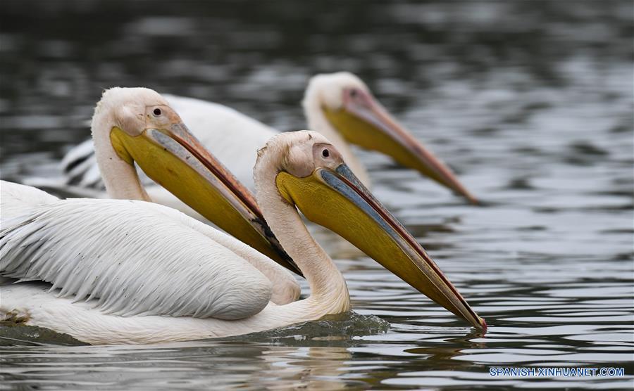 HAINAN, enero 16, 2019 (Xinhua) -- Pelícanos se alimentan en un estanque de peces, en la villa de Dingwen del condado de Longquan en Haikou, capital de la provincia de Hainan, en el sur de China, el 16 de enero de 2019. (Xinhua/Yang Guanyu)