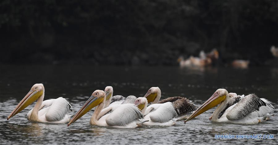 HAINAN, enero 16, 2019 (Xinhua) -- Pelícanos nadan en un estanque de peces, en la villa de Dingwen del condado de Longquan en Haikou, capital de la provincia de Hainan, en el sur de China, el 16 de enero de 2019. (Xinhua/Yang Guanyu)