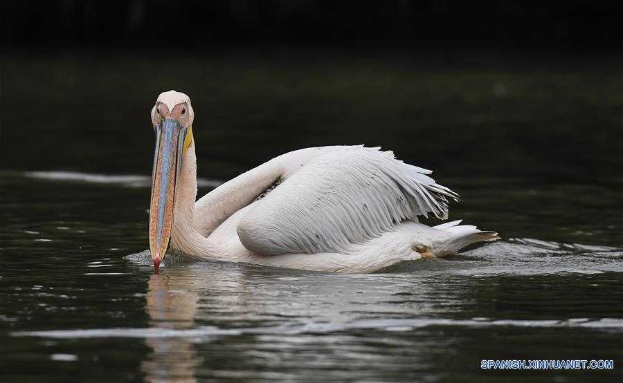 HAINAN, enero 16, 2019 (Xinhua) -- Un pelícano nada en un estanque de peces, en la villa de Dingwen del condado de Longquan en Haikou, capital de la provincia de Hainan, en el sur de China, el 16 de enero de 2019. (Xinhua/Yang Guanyu)
