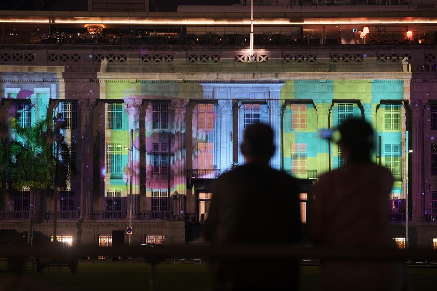 SINGAPUR, enero 16, 2019 (Xinhua) -- Invitados observan una proyección de luz durante una vista previa del Festival Luz de Noche, en la ciudad de Singapur, capital de Singapur, el 16 de enero de 2019. El Festival Luz de Noche se llevará a cabo del 18 de enero al 24 de febrero. (Xinhua/Then Chih Wey)