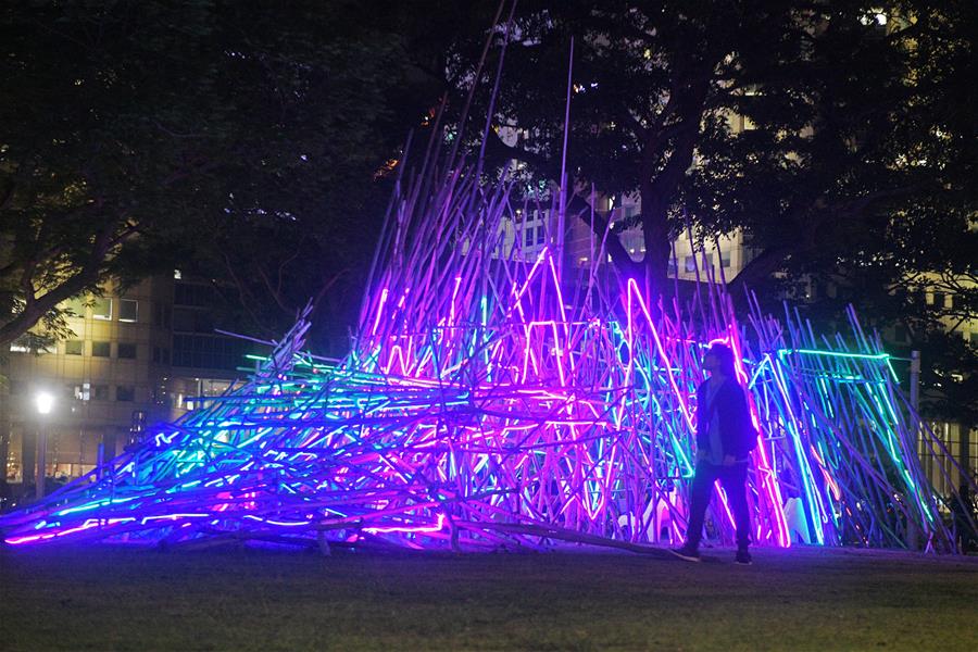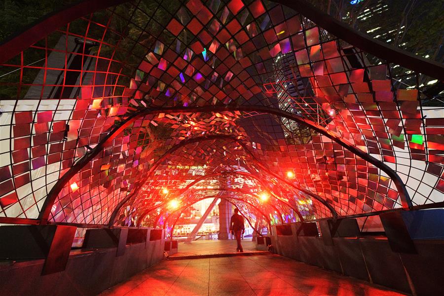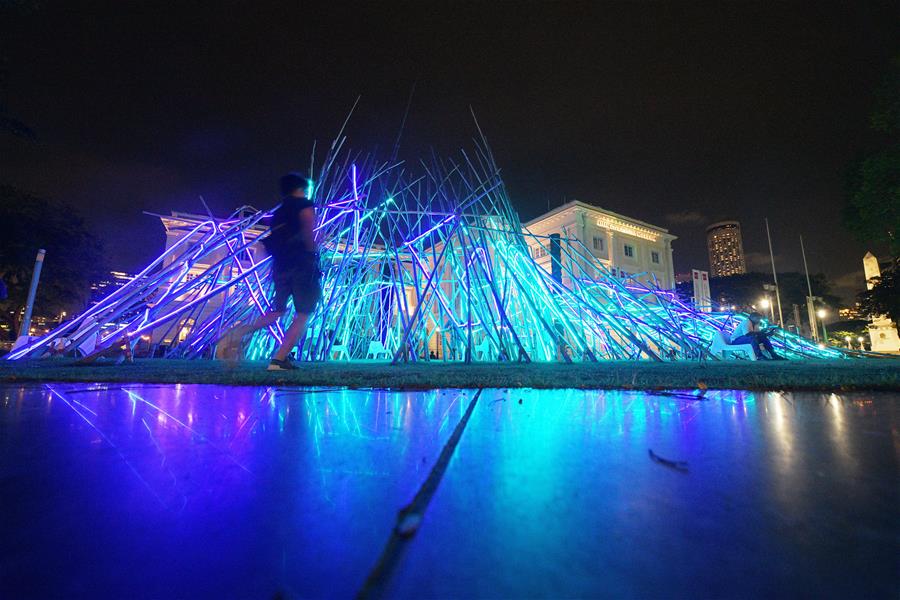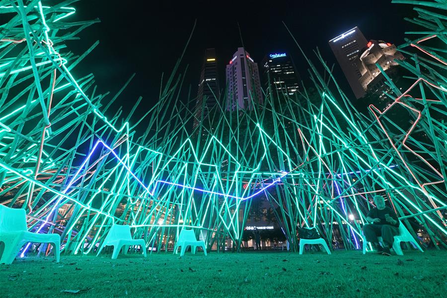 SINGAPUR, enero 16, 2019 (Xinhua) -- Un invitado camina frente a las instalaciones de arte durante una vista previa del Festival Luz de Noche, en la ciudad de Singapur, capital de Singapur, el 16 de enero de 2019. El Festival Luz de Noche se llevará a cabo del 18 de enero al 24 de febrero. (Xinhua/Then Chih Wey)