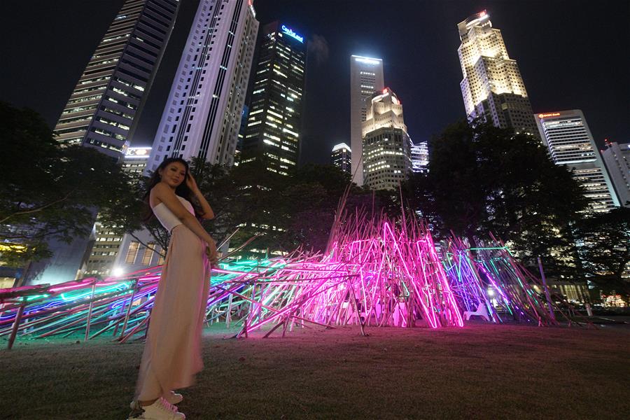 SINGAPUR, enero 16, 2019 (Xinhua) -- Una invitada posa frente a las instalaciones de arte durante una vista previa del Festival Luz de Noche, en la ciudad de Singapur, capital de Singapur, el 16 de enero de 2019. El Festival Luz de Noche se llevará a cabo del 18 de enero al 24 de febrero. (Xinhua/Then Chih Wey)