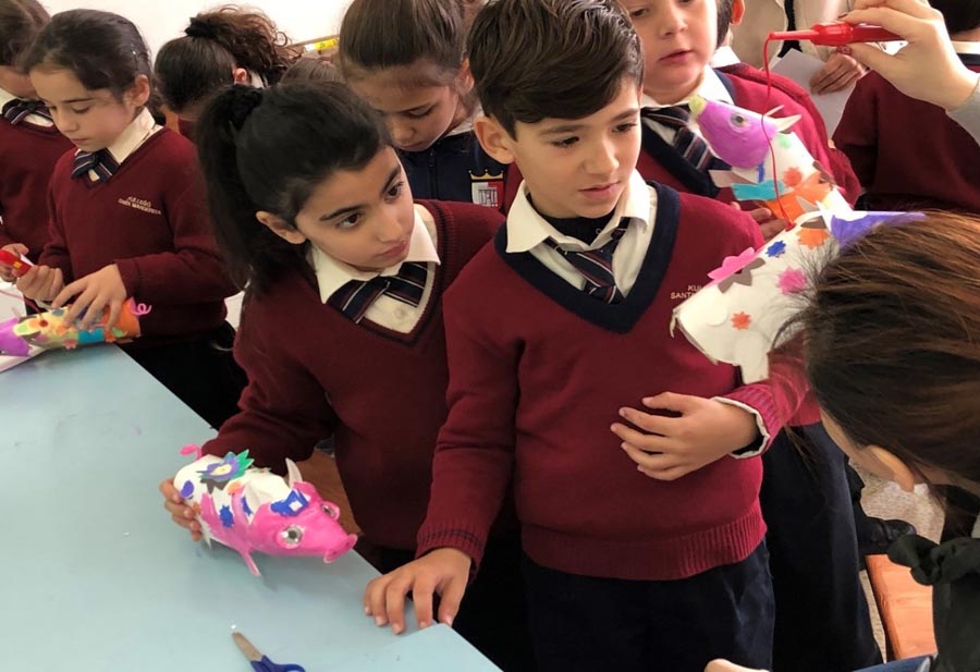 Estudiantes de primaria crean cerditos utilizando la técnica tradicional china del recortado en papel, Kalkara, Malta, 10 de enero del 2019. [Foto: Chinaculture. org]