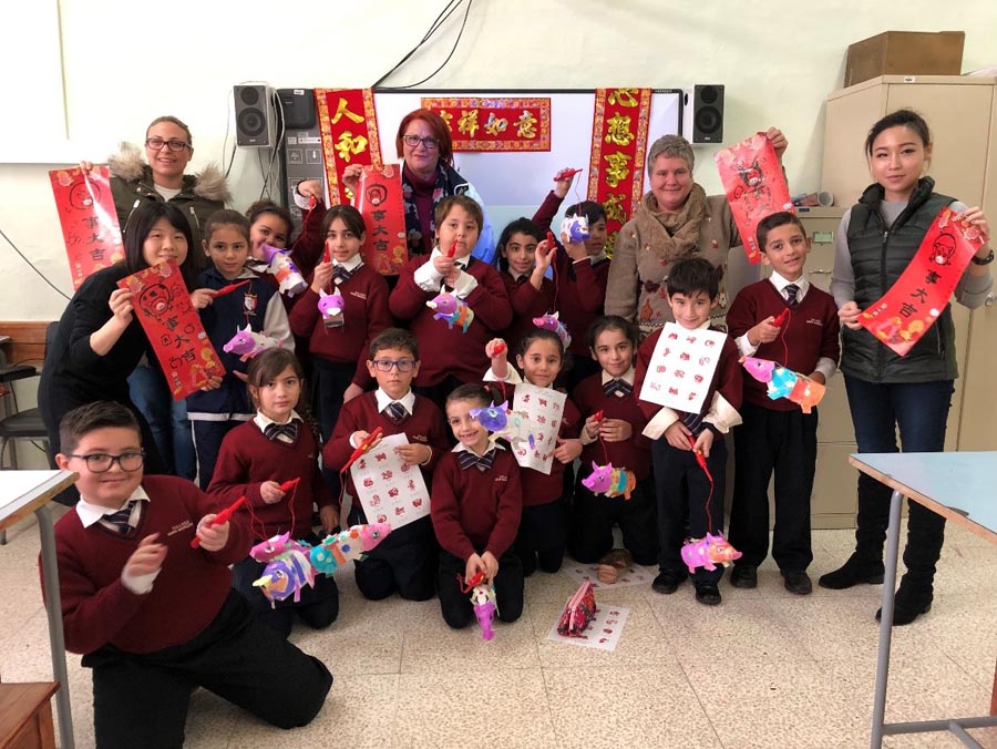 Estudiantes de primaria crean cerditos utilizando la técnica tradicional china del recortado en papel, Kalkara, Malta, 10 de enero del 2019. [Foto: Chinaculture. org]