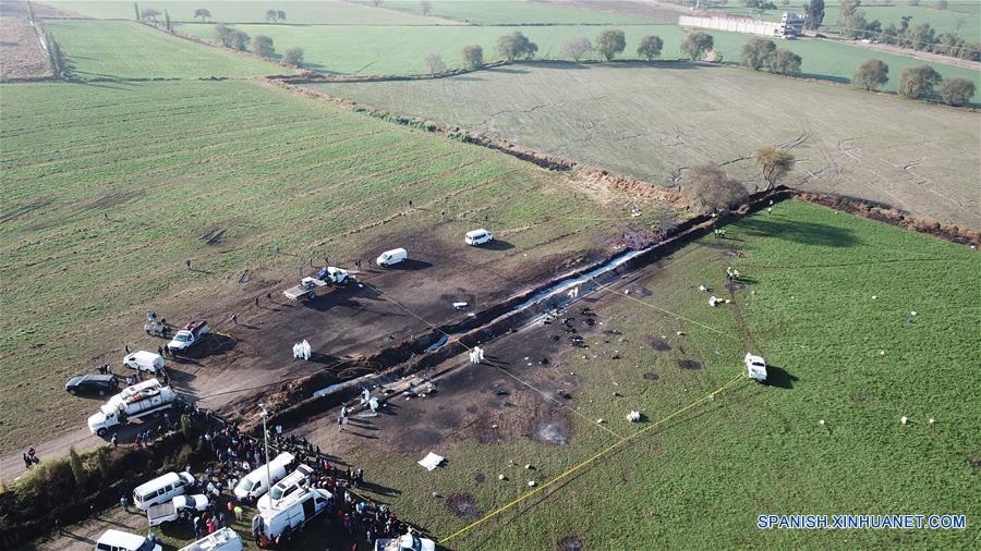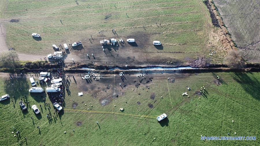 Imagen tomada con un dron del sitio de una explosión, en el municipio de Tlahuelilpan, estado de Hidalgo, México, el 19 de enero de 2019. La explosión e incendio en una toma clandestina en un ducto de hidrocarburos la víspera en el central estado mexicano de Hidalgo acumula un saldo de 66 personas fallecidas y 76 heridas, informaron el sábado las autoridades. El gobernador de Hidalgo, Omar Fayad, dijo que el saldo todavía era preliminar porque muchas personas se encontraban debatiéndose entre "la vida y la muerte", a consecuencia del percance ocurrido la tarde-noche del viernes en el municipio de Tlahuelilpan. (Xinhua/Xin Yuewei)
