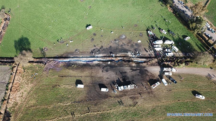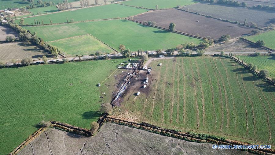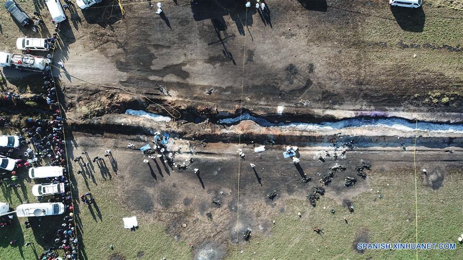 Imagen tomada con un dron del sitio de una explosión, en el municipio de Tlahuelilpan, estado de Hidalgo, México, el 19 de enero de 2019. La explosión e incendio en una toma clandestina en un ducto de hidrocarburos la víspera en el central estado mexicano de Hidalgo acumula un saldo de 66 personas fallecidas y 76 heridas, informaron el sábado las autoridades. El gobernador de Hidalgo, Omar Fayad, dijo que el saldo todavía era preliminar porque muchas personas se encontraban debatiéndose entre "la vida y la muerte", a consecuencia del percance ocurrido la tarde-noche del viernes en el municipio de Tlahuelilpan. (Xinhua/Xin Yuewei)