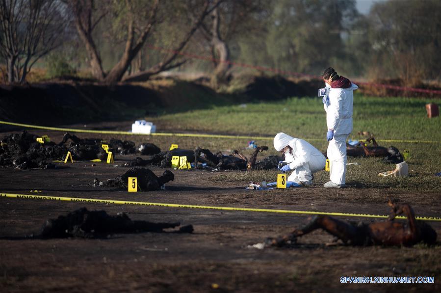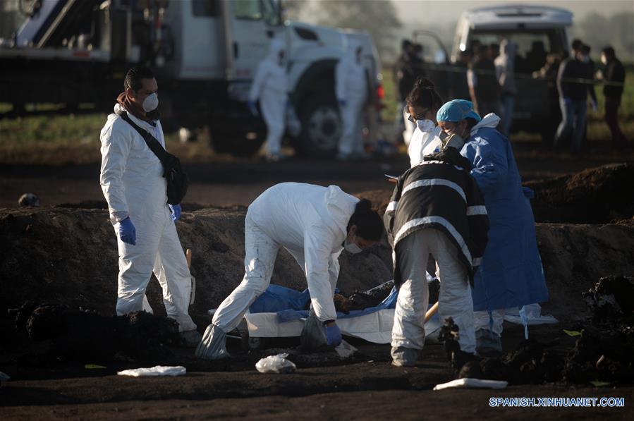 Personal del Servicio Médico Forense trabaja en el sitio de una explosión, en el municipio de Tlahuelilpan, estado de Hidalgo, México, el 19 de enero de 2019. La explosión e incendio en una toma clandestina en un ducto de hidrocarburos la víspera en el central estado mexicano de Hidalgo acumula un saldo de 66 personas fallecidas y 76 heridas, informaron el sábado las autoridades. El gobernador de Hidalgo, Omar Fayad, dijo que el saldo todavía era preliminar porque muchas personas se encontraban debatiéndose entre "la vida y la muerte", a consecuencia del percance ocurrido la tarde-noche del viernes en el municipio de Tlahuelilpan. (Xinhua/Mandolov Solís)