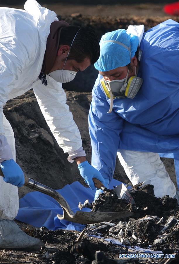 Personal del Servicio Médico Forene trabaja en el sitio de una explosión, en el municipio de Tlahuelilpan, estado de Hidalgo, México, el 19 de enero de 2019. La explosión e incendio en una toma clandestina en un ducto de hidrocarburos la víspera en el central estado mexicano de Hidalgo acumula un saldo de 66 personas fallecidas y 76 heridas, informaron el sábado las autoridades. El gobernador de Hidalgo, Omar Fayad, dijo que el saldo todavía era preliminar porque muchas personas se encontraban debatiéndose entre "la vida y la muerte", a consecuencia del percance ocurrido la tarde-noche del viernes en el municipio de Tlahuelilpan. (Xinhua/Carolina Endara)