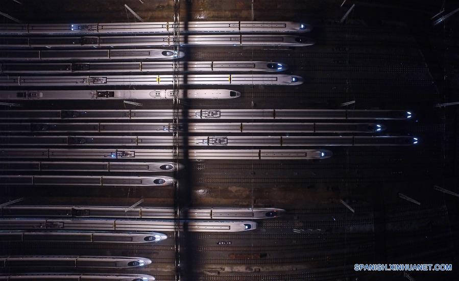 NANCHANG, enero 20, 2019 (Xinhua) -- Vista aérea de trenes de alta velocidad luego del mantenimiento, en Nanchang, capital de la provincia de Jianxi, en el este de China, el 20 de enero de 2019. El pico de viajes por el Festival de Primavera 2019, conocido como Chunyun, dará inicio el 21 de enero. El Festival de Primavera, o A?o Nuevo Lunar chino, se celebra el 5 de febrero este a?o. (Xinhua/Wan Xiang)