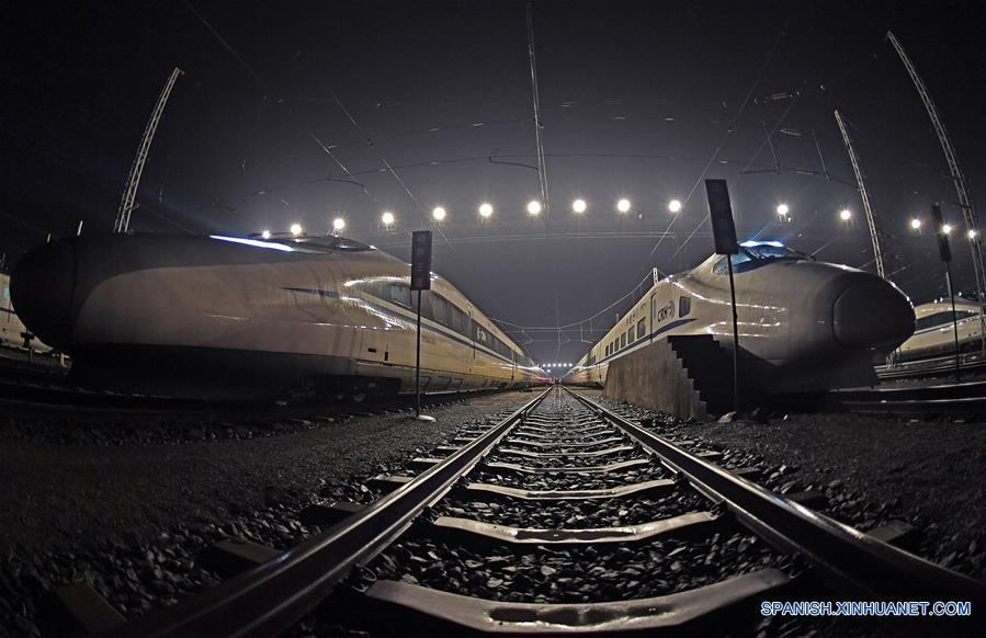 NANCHANG, enero 20, 2019 (Xinhua) -- Vista aérea de trenes de alta velocidad luego del mantenimiento, en Nanchang, capital de la provincia de Jianxi, en el este de China, el 20 de enero de 2019. El pico de viajes por el Festival de Primavera 2019, conocido como Chunyun, dará inicio el 21 de enero. El Festival de Primavera, o A?o Nuevo Lunar chino, se celebra el 5 de febrero este a?o. (Xinhua/Wan Xiang)