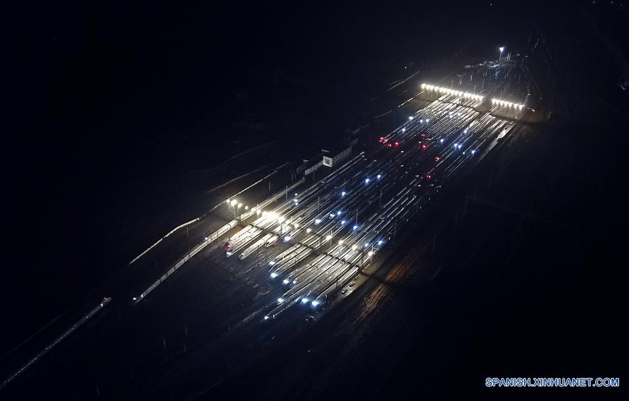 NANCHANG, enero 20, 2019 (Xinhua) -- Vista aérea de trenes de alta velocidad luego del mantenimiento, en Nanchang, capital de la provincia de Jianxi, en el este de China, el 20 de enero de 2019. El pico de viajes por el Festival de Primavera 2019, conocido como Chunyun, dará inicio el 21 de enero. El Festival de Primavera, o A?o Nuevo Lunar chino, se celebra el 5 de febrero este a?o. (Xinhua/Wan Xiang)