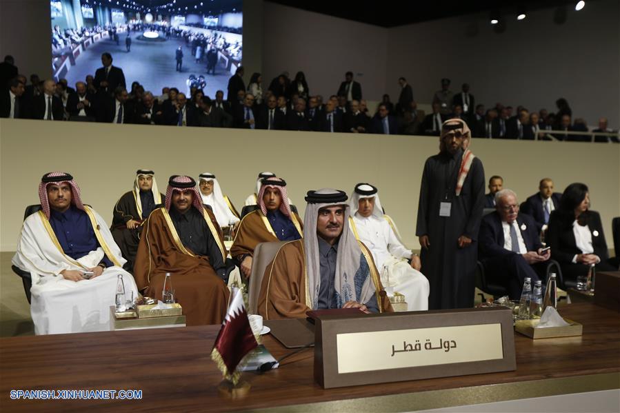 BEIRUT, enero 20, 2019 (Xinhua) -- El emir qatarí, el jeque Tamim bin Hamad Al-Thani (c), asiste a la cuarta Cumbre Arabe de Desarrollo Económico y Social, en Beirut, Líbano, el 20 de enero de 2019. De acuerdo con información de la prensa local, la cuarta Cumbre Arabe de Desarrollo Económico y Social inició el domingo en Beirut. (Xinhua/Bilal Jawich)