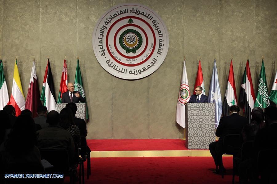 El secretario general de la Liga Arabe, Ahmed Aboul-Gheit (i), y el ministro de Relaciones Exteriores libanés, Gebran Bassil (d), participan en una conferencia de prensa después de la Cumbre Arabe de Desarrollo Económico y Social, en Beirut, Líbano, el 20 de enero de 2019. (Xinhua/Li Liangyong)