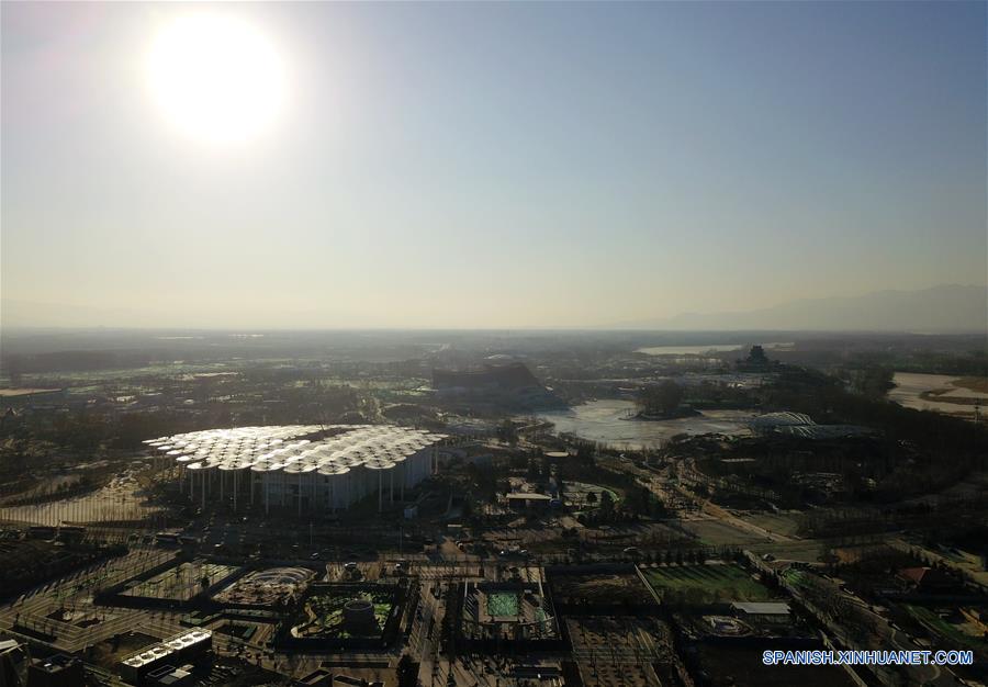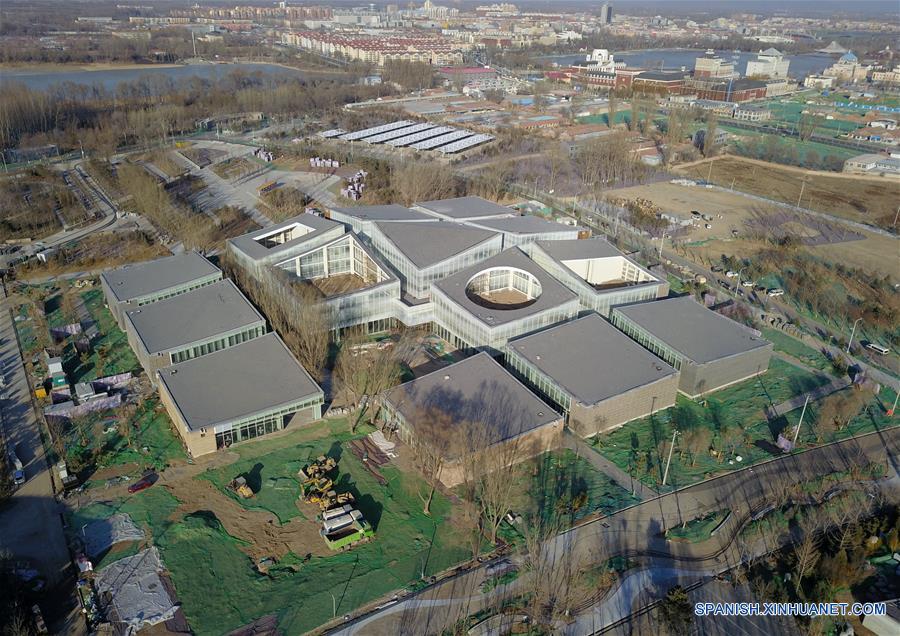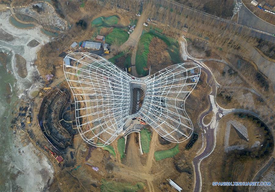 Imagen del 11 de enero de 2019 de una vista aérea del sitio de la construcción del Pabellón Internacional de la Exposición Hortícola Internacional de Beijing 2019 (conocida comúnmente como Expo 2019 Beijing) en el distrito de Yanqing, en Beijing, capital de China. El sábado marca la cuenta regresiva de 100 días para la Expo 2019 Beijing, la cual está programada para ser inaugurada el 29 de abril de 2019 en el distrito Yanqing. La construcción de toda la infraestructura para los 100 jardines interiores y exteriores en la exposición va bien. (Xinhua/Zhang Chenlin)