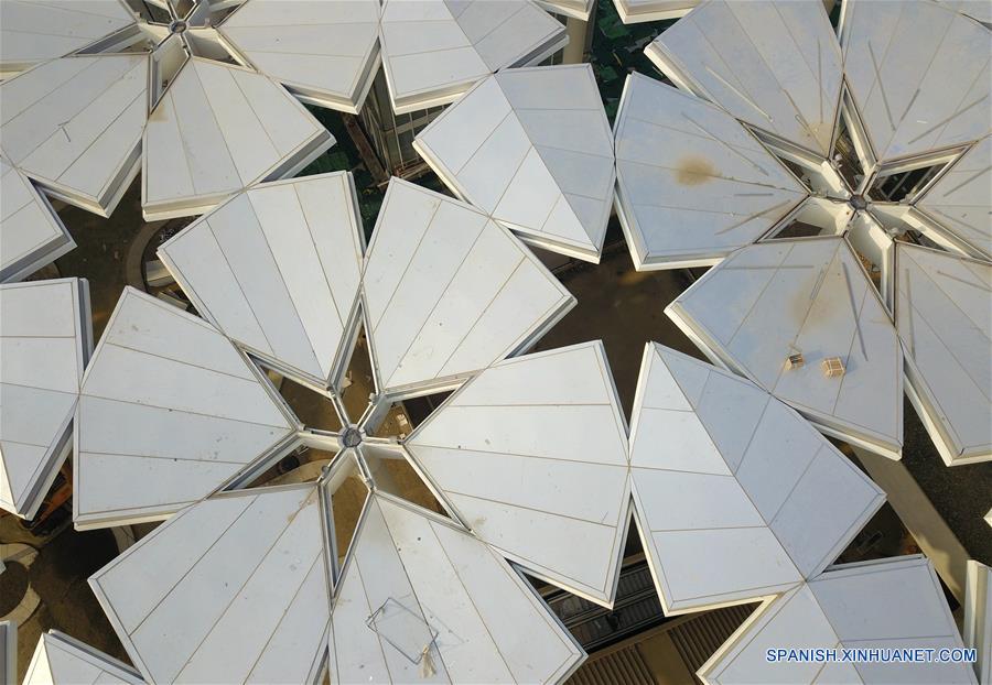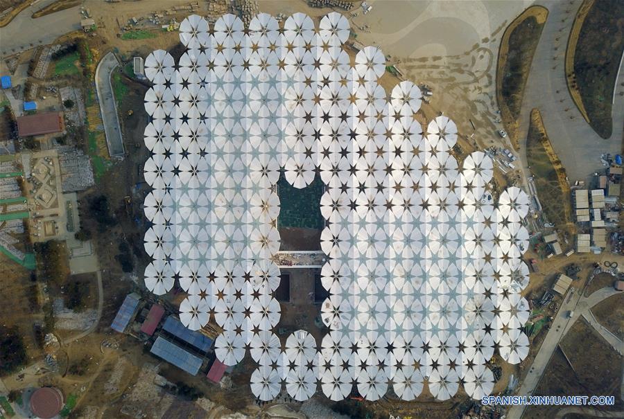 Imagen del 11 de enero de 2019 de una vista aérea del sitio de la construcción construcción del Pabellón Planta de la Exposición Hortícola Internacional de Beijing 2019 (conocida comúnmente como Expo 2019 Beijing) en el distrito de Yanqing, en Beijing, capital de China. El sábado marca la cuenta regresiva de 100 días para la Expo 2019 Beijing, la cual está programada para ser inaugurada el 29 de abril de 2019 en el distrito Yanqing. La construcción de toda la infraestructura para los 100 jardines interiores y exteriores en la exposición va bien. (Xinhua/Zhang Chenlin)