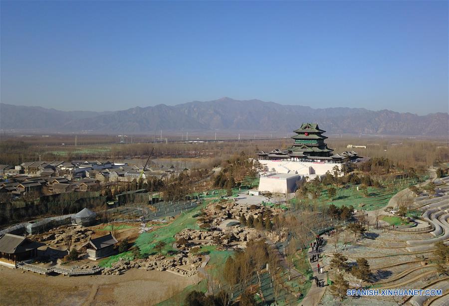 BEIJING, enero 19, 2019 (Xinhua) -- Imagen del 11 de enero de 2019 de una vista aérea del sitio de la construcción del Pabellón Chino de la Exposición Hortícola Internacional de Beijing 2019 (conocida comúnmente como Expo 2019 Beijing) en el distrito de Yanqing, en Beijing, capital de China. El sábado marca la cuenta regresiva de 100 días para la Expo 2019 Beijing, la cual está programada para ser inaugurada el 29 de abril de 2019 en el distrito Yanqing. La construcción de toda la infraestructura para los 100 jardines interiores y exteriores en la exposición va bien. (Xinhua/Zhang Chenlin)