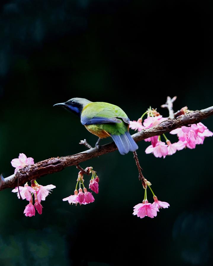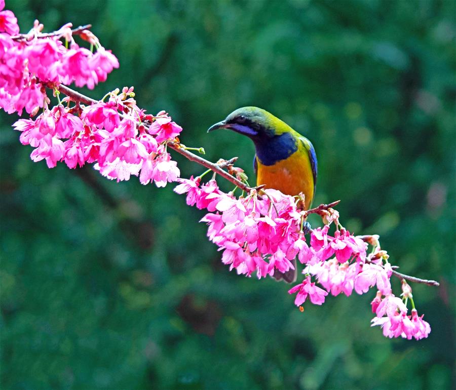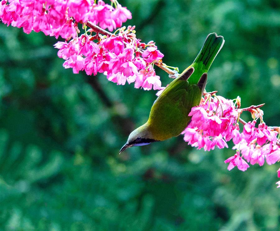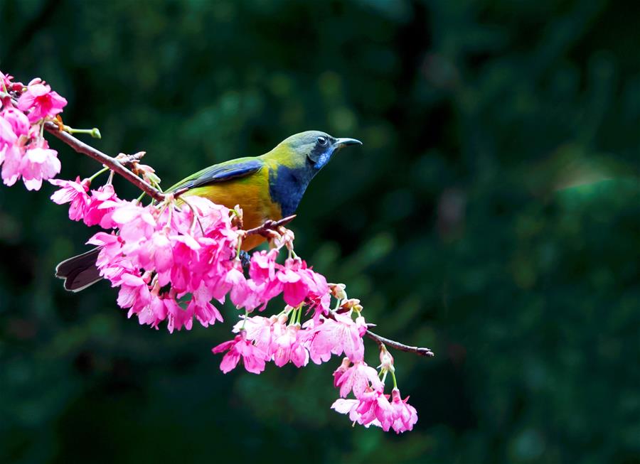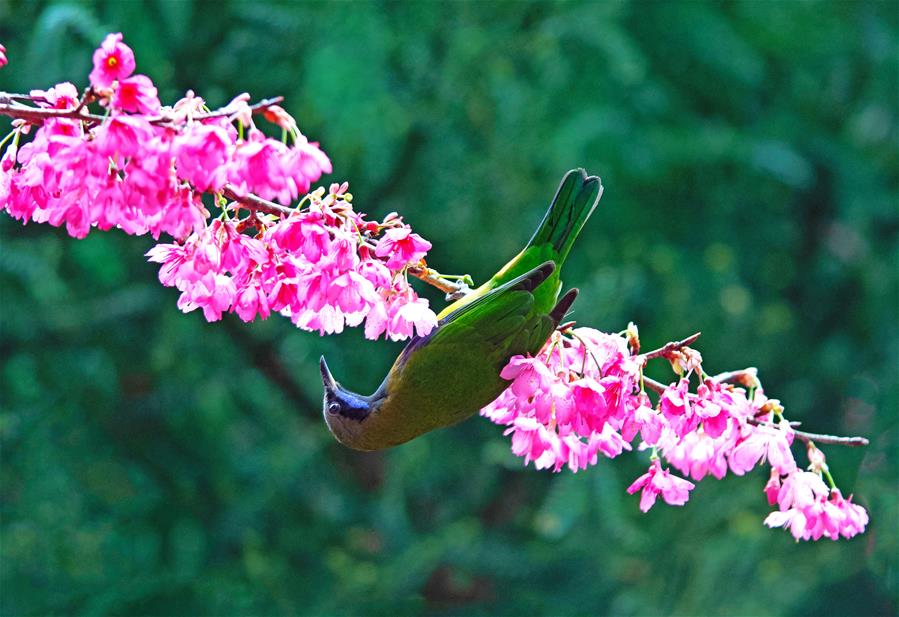 FUJIAN, enero 21, 2019 (Xinhua) -- Imagen del 20 de enero de 2019 de un pájaro recolectando miel de las flores de cerezo en el Parque Nacional Forestal de Fuzhou en Fuzhou, capital de la provincia de Fujian en el sureste de China. (Xinhua/Mei Yongcun)