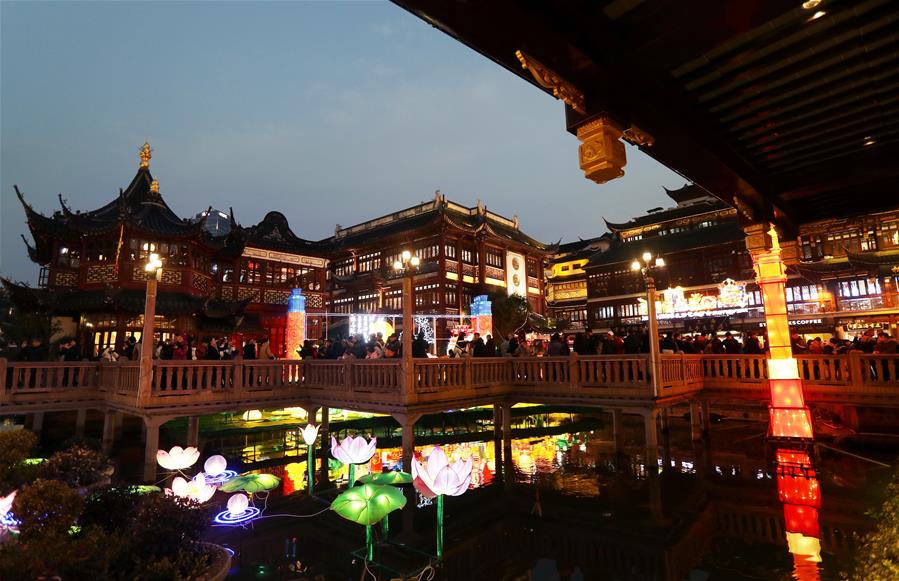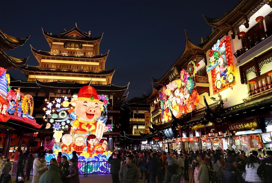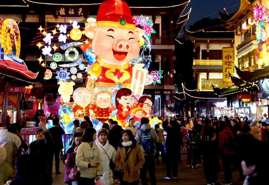 SHANGHAI, enero 21, 2019 (Xinhua) -- Personas acuden al Jardín Yuyuan para observar linternas en Shanghai, en el este de China, el 21 de enero de 2019. Una feria de linternas empezó el lunes en Shanghai. (Xinhua/Liu Ying)