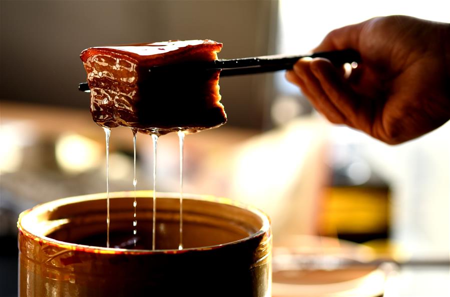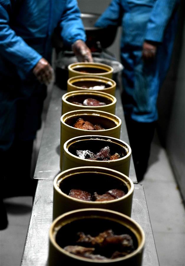 HEBEI, enero 22, 2019 (Xinhua) -- Un platillo hecho con carne conservada de Shuizhagou es exhibido en una fábrica en el condado Pingshan, en la provincia de Hebei, en el norte de China, el 22 de enero de 2019. La carne conservada de Shuizhagou, una especialidad local famosa por su delicado sabor y fino método de elaboración, es un regalo para familias y amigos en ocasiones importantes. (Xinhua/Chen Qibao)