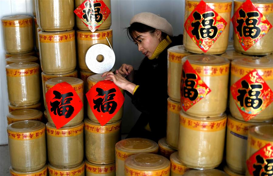 HEBEI, enero 22, 2019 (Xinhua) -- Una trabajadora pega el carácter chino Fu, o felicidad en espa?ol, en botes con carne conservada de Shuizhagou en una fábrica en el condado Pingshan, en la provincia de Hebei, en el norte de China, el 22 de enero de 2019. La carne conservada de Shuizhagou, una especialidad local famosa por su delicado sabor y fino método de elaboración, es un regalo para familias y amigos en ocasiones importantes. (Xinhua/Chen Qibao)