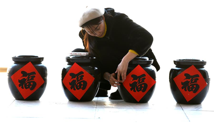 HEBEI, enero 22, 2019 (Xinhua) -- Una trabajadora pega el carácter chino Fu, o felicidad en espa?ol, en ollas con carne conservada de Shuizhagou en una fábrica en el condado Pingshan, en la provincia de Hebei, en el norte de China, el 22 de enero de 2019. La carne conservada de Shuizhagou, una especialidad local famosa por su delicado sabor y fino método de elaboración, es un regalo para familias y amigos en ocasiones importantes. (Xinhua/Chen Qibao)