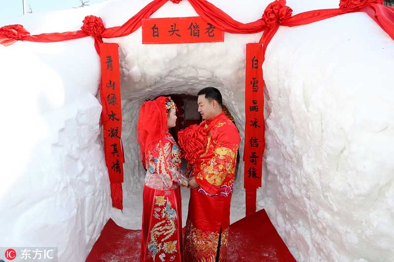 Una pareja se casa en una cueva de nieve