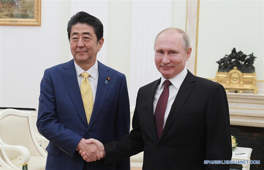 El presidente de Rusia, Vladimir Putin (d), estrecha la mano con el primer ministro de Japón, Shinzo Abe, durante su reunión en Moscú, Rusia, el 22 de enero de 2019. (Xinhua/Sputnik)