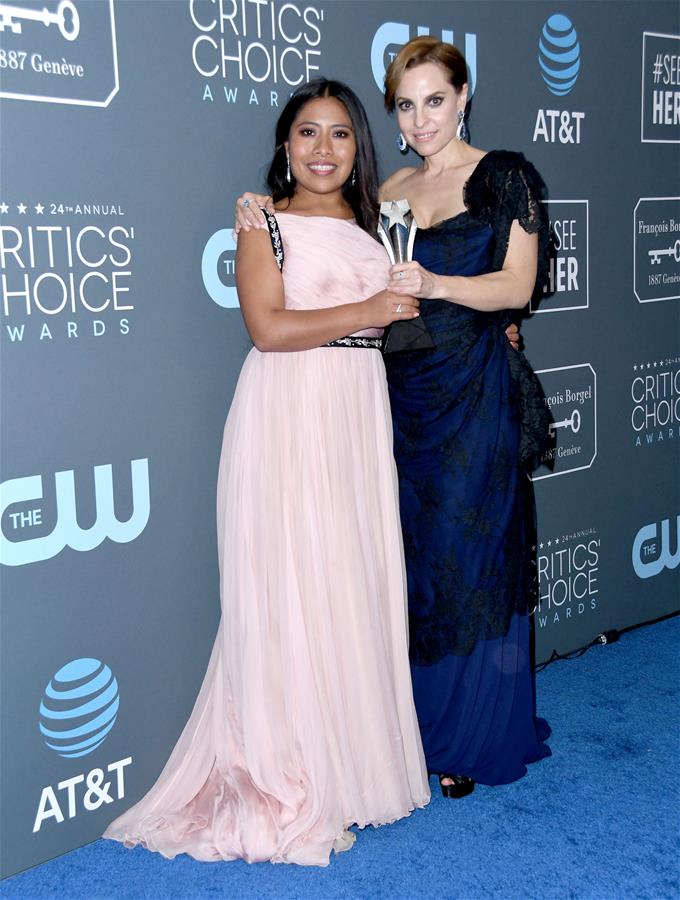 CALIFORNIA, enero 22, 2019 (Xinhua) -- Imagen proveída por ZUMAPRESS del 13 de enero de 2019 de las actrices mexicanas Marina de Tavira (d), y Yalitza Aparicio (i), posando en los 24 Premios de Crítica Cinematográfica, en Santa Monica, California, Estados Unidos. La cinta dramática en blanco y negro "Roma" y la comedia histórica "La favorita" encabezan la competencia en la edición 91 de los Premios Oscar con 10 nominaciones cada una, anunció el martes la Academia de Artes y Ciencias cinematográficas. La cinta en espa?ol, recibió 10 nominaciones en total, incluyendo mejor película, mejor director para el cineasta mexicano Alfonso Cuarón, mejor actriz, mejor actriz de reparto, mejor película en lengua extranjera y mejor fotografía. (Xinhua/Birdie Thompson/AdMedia/ZUMAPRESS)