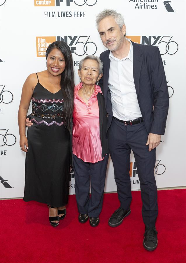 NUEVA YORK, enero 22, 2019 (Xinhua) -- Imagen proveída por ZUMAPRESS del 5 de octubre de 2018 del cineasta mexicano Alfonso Cuarón (d), su ni?era Liboria Rodríguez (c), y la actriz mexicanas Yalitza Aparicio (i), asistiendo al estreno de la película "Roma" durante el 56 Festival de Cine de Nueva York, en Nueva York, Estados Unidos. La cinta dramática en blanco y negro "Roma" y la comedia histórica "La favorita" encabezan la competencia en la edición 91 de los Premios Oscar con 10 nominaciones cada una, anunció el martes la Academia de Artes y Ciencias cinematográficas. La cinta en espa?ol, recibió 10 nominaciones en total, incluyendo mejor película, mejor director para el cineasta mexicano Alfonso Cuarón, mejor actriz, mejor actriz de reparto, mejor película en lengua extranjera y mejor fotografía. (Xinhua/Lev Radin/Pacific Press/ZUMAPRESS)
