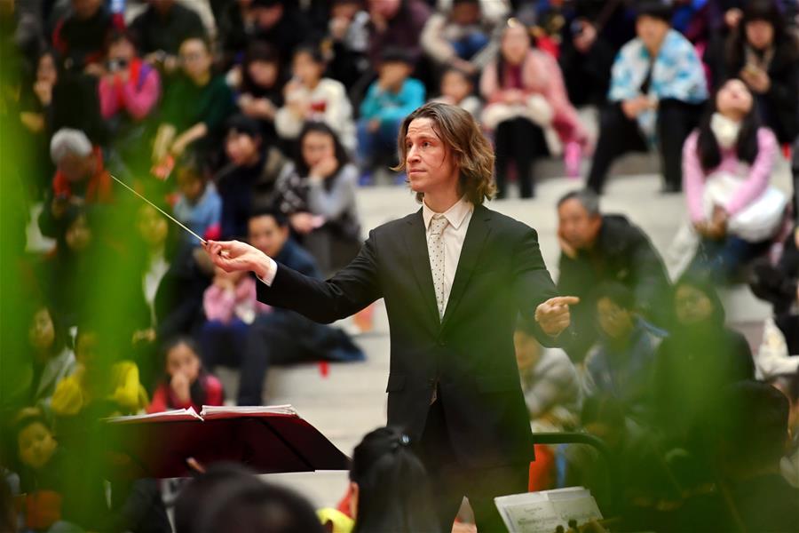 SHANXI, enero 22, 2019 (Xinhua) -- Imagen del 21 de enero de 2019 de un director de orquesta dirigiendo a la Orquesta Sinfónica de Shanxi durante un concierto llevado a cabo en la Biblioteca de Taiyuan, en Taiyuan, capital de la provincia de Shanxi, en el norte de China. (Xinhua/Cao Yang)