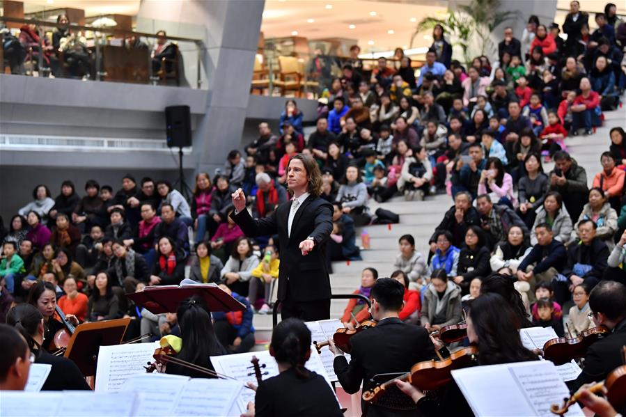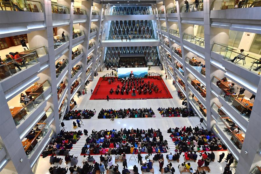 SHANXI, enero 22, 2019 (Xinhua) -- Imagen del 21 de enero de 2019 de músicos de la Orquesta Sinfónica de Shanxi participando durante un concierto llevado a cabo en la Biblioteca de Taiyuan, en Taiyuan, capital de la provincia de Shanxi, en el norte de China. (Xinhua/Cao Yang)