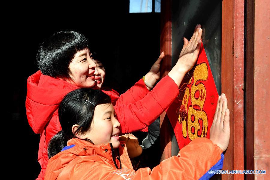 SHANDONG, enero 23, 2019 (Xinhua) -- Imagen del 16 de enero de 2019 de la voluntaria Gu Shengyuan pegando un cartel del carácter chino "Fu", que significa buena suerte, en una puerta con Nuonuo (frente), en la villa de Wucun de la ciudad de Linyi, provincia de Shandong, en el este de China. Las hermanas gemelas Gu Shengyuan y Gu Shengyan son miembros del grupo de servicio voluntario que ayuda a ni?os pobres y huérfanos que viven en las áreas monta?osas en Linyi. Fundado el 19 de abril de 2018, el grupo con más de 6,000 voluntarios proporciona apoyo para más de 3,500 ni?os pobres y huérfanos. (Xinhua/Guo Xulei)