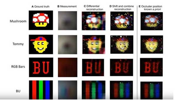 Los investigadores demuestran un enfoque de periscopía computacional utilizando una cámara digital ordinaria controlada por una computadora. Fuera de la vista de la cámara, una imagen que se muestra en una pantalla está parcialmente oculta por un objeto opaco. Este objeto de oclusión proyecta una sombra parcial (penumbra) en una pared reflectante. La cámara digital captura instantáneas de la distribución de la luz desde la pared reflectante, que se compone de la luz que emana de la pantalla oculta, así como de la penumbra del objeto que ocluye. Después, los algoritmos informáticos reconstruyen las instantáneas para crear una imagen de color bidimensional de la escena oculta. Los autores presentan imágenes reconstruidas, incluyendo una cara de dibujo animado, un champi?ón, letras y patrones de rayas de colores.
