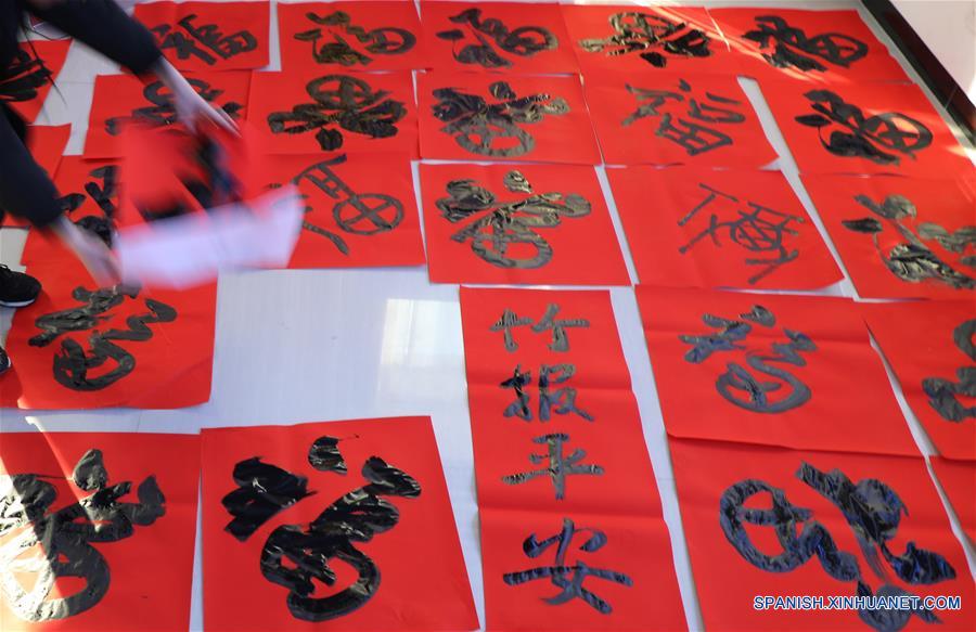 SHANDONG, enero 23, 2019 (Xinhua) -- Una empleada clasifica versos pareados y trabajos de caligrafía con el carácter chino "fu", que significa felicidad, escrito por voluntarios, en la comunidad de Dongcheng del condado de Tancheng en Linyi, provincia de Shandong, en el este de China, el 23 de enero de 2019. Quince equipos voluntarios visitan las villas en el condado de Tancheng, llevando espectáculos y pergaminos del Festival de Primavera para dar la bienvenida al A?o Nuevo Lunar. (Xinhua/Zhang Chunlei)