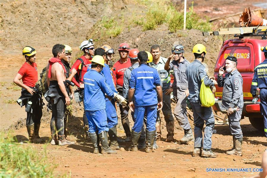 Imagen proveída por AGENCIA ESTADO de bomberos trabajando en el lugar destruido por los residuos tras la ruptura de una represa de residuos de la minera brasile?a Vale, en Brumadinho, ciudad en la región metropolitana de Belo Horizonte, capital regional de Minas Gerais, Brasil, el 25 de enero de 2019. Al menos 200 desaparecidos y cuatro heridos es el saldo preliminar de la ruptura de una represa de residuos de la minera brasile?a Vale, la mayor exportadora de hierro del mundo, en la región metropolitana de Belo Horizonte, informó el viernes el cuartel general de Bomberos de la ciudad. (Xinhua/Uarlen Valerio/O TEMPO/AGENCIA ESTADO)