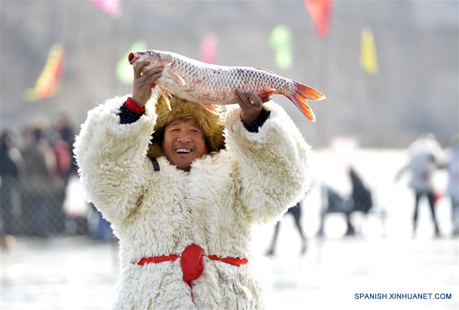 HOHHOT, enero 26, 2019 (Xinhua) -- Un visitante exhibe un pescado recién atrapado en la Reserva Qianyaozi en Hohhot, capital de la Región Autónoma de Mongolia Interior, en el norte de China, el 26 de enero de 2019. Un festival turístico de pesca de invierno de dos días abrió en Hohhot el sábado, en el cual 18 herederos de la pesca de invierno del Lago Chagan mostraron a visitantes las formas tradicionales de pesca. La pesca de invierno en el Lago Chagan cubierto de hielo se remonta a las dinastías Liao y Jin, del siglo X al siglo XIII, en China y fue listado como patrimonio cultural intangible nacional en 2008. (Xinhua/Wang Zheng)