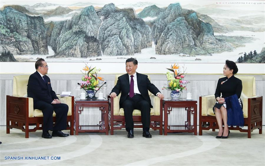 Xi Jinping (c), secretario general del Comité Central del Partido Comunista de China (PCCh) y presidente chino, y su esposa Peng Liyuan se reúnen con Ri Su Yong, miembro del Buró Político del Comité Central del Partido de los Trabajadores de Corea (PTC), vicepresidente del Comité Central del PTC y director del Departamento Internacional del partido, quien está al frente de una compa?ía artística de la República Popular Democrática de Corea (RPDC) en Beijing, capital de China, el 27 de enero de 2019. (Xinhua/Xie Huanchi)