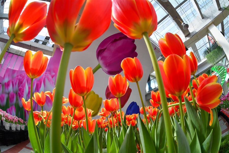 GUANGDONG, enero 28, 2019 (Xinhua) -- Imagen del 22 de enero de 2019 de tulipanes exhibidos en un jardín en la zona de libre comercio de Nansha, en la provincia de Guangdong, en el sur de China. Más de 30 variedades de tulipanes traídos del Jardín Keukenhof de Países Bajos fueron exhibidos recientemente. (Xinhua/Liu Dawei)