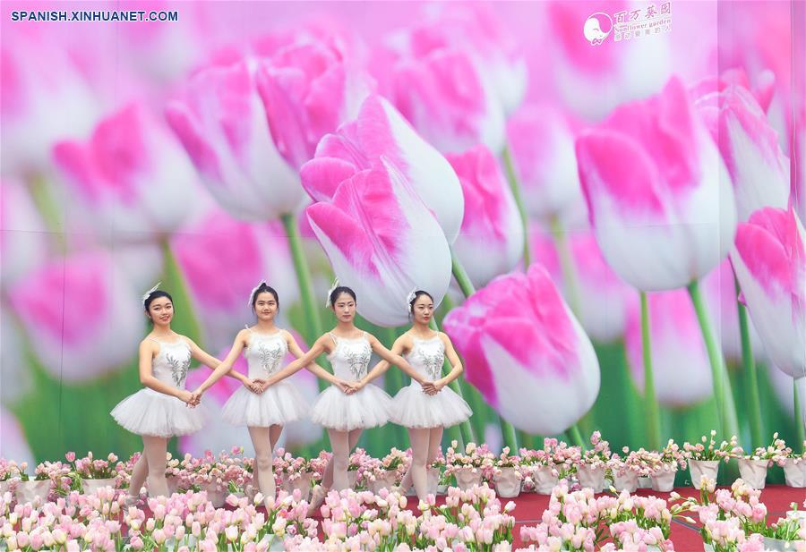 GUANGDONG, enero 28, 2019 (Xinhua) -- Bailarinas realizan una danza de ballet durante una exposición de tulipanes, en un jardín en la zona de libre comercio de Nansha, en la provincia de Guangdong, en el sur de China, el 28 de enero de 2019. Más de 30 variedades de tulipanes traídos del Jardín Keukenhof de Países Bajos fueron exhibidos recientemente. (Xinhua/Liu Dawei)